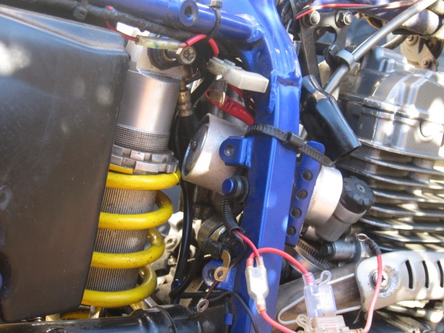ピローボールのメンテナンスにはリアクッションを外してカラーを取外し、グリースを詰め直すのが一番だと思う。リアクッションを外すためにはバッテリーとバッテリーボックスを取り外すだけでなく、やっかいなリザーバータンクの取り回しのためにスターターリレーのステーとリレーのカプラを取り外すと楽になる。その際、本体と繋がれているホースに無理を掛けないようにしたい。なお、編者の車体はメーター変更のためにバッテリーからメーター周りに直接配線を追加しているのとバッテリーの充電用にコネクタを追加しているため、写真中にヒューズケースが元のと併せて 3つ見えている。また、リレーの車体側のカプラが破損していたことがあって水などの付着を避けるために追加したカプラのカバーも見える。(2026年1月追記)
